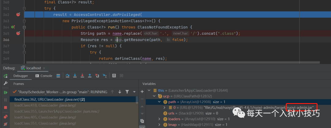 根据双亲委派模型会去引导类加载器和扩展类加载器找该类,这肯定是找不到的,然后回到 AppClassLoader 来加载类,这里只有一个 ruoyi-admin.jar 包,找不到 HandlerInterceptorAdapter